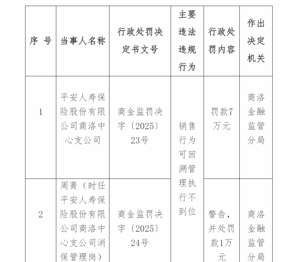 12月26日,国家金融监督管理总局商洛监管分局行政处罚信息公示表商金监罚决字〔2025〕23、24、25、26号显示,平安人寿保险股份有限公司商洛中心支公司,销售行为可回溯管理执行不到位,被罚款7万元。