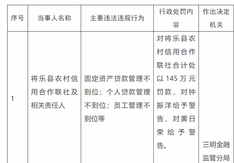 12月26日,三明金融监管分局行政处罚信息公示表显示,将乐县农村信用合作联社,固定资产贷款管理不到位;个人贷款管理不到位;员工管理不到位等,合计被处以145万元罚款。
