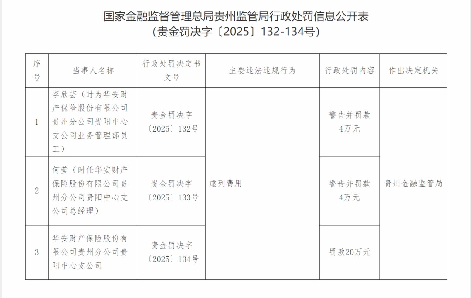 12月26日,国家金融监督管理总局贵州监管局行政处罚信息公开表显示,华安财产保险股份有限公司贵州分公司贵阳中心支公司,虚列费用,被罚款20万元。