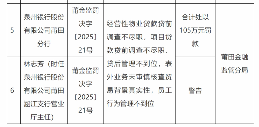 12月26日,莆田金融监管分局行政处罚信息公示表显示,泉州银行股份有限公司莆田分行,经营性物业贷款贷前调查不尽职,项目贷款贷前调查不尽职、贷后管理不到位,表外业务未审慎核查贸易背景真实性,员工行为管理不到位,合计被处以105万元罚款;林志芳(时任泉州银行股份有限公司莆田涵江支行营业厅主任),被警告。