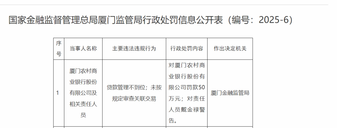 12月26日,国家金融监督管理总局厦门监管局行政处罚信息公开表(编号:2025-6)显示,厦门农村商业银行股份有限公司,贷款管理不到位;未按规定审查关联交易,被罚款50万元;责任人员戴金禄被警告。