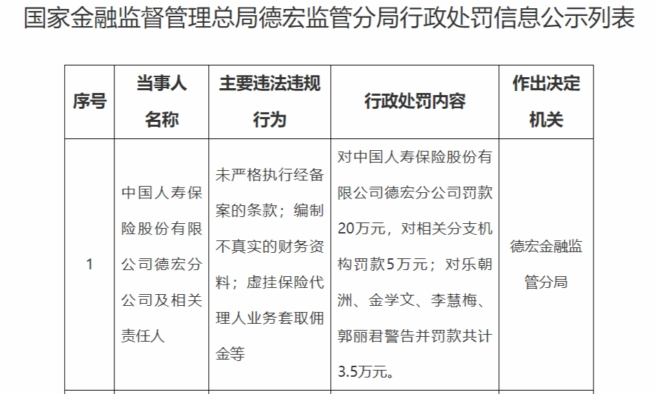 12月26日,国家金融监督管理总局德宏监管分局行政处罚信息公示列表显示,中国人寿保险股份有限公司德宏分公司,未严格执行经备案的条款;编制不真实的财务资料;虚挂保险代理人业务套取佣金等,被罚款20万元;相关分支机构被罚款5万元。
