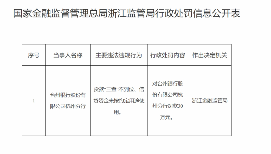 12月26日,国家金融监督管理总局浙江监管局行政处罚信息公开表显示,台州银行股份有限公司杭州分行,贷款“三查”不到位、信贷资金未按约定用途使用,被罚款30万元。