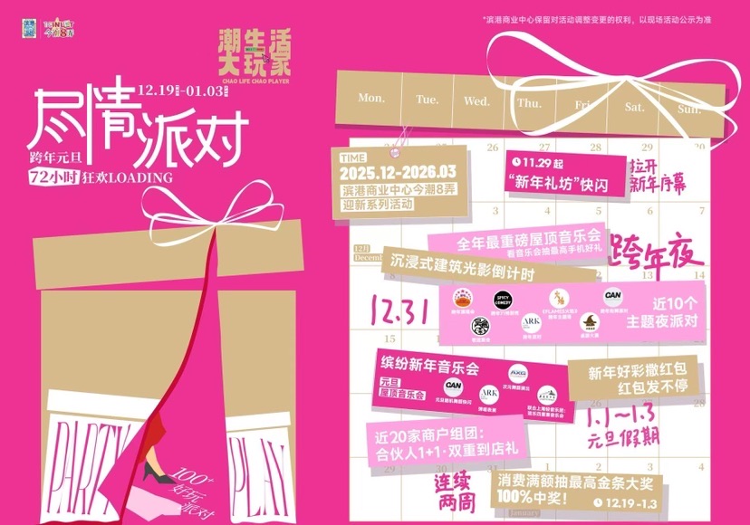 2026即将来临,滨港商业中心今潮8弄从12月至明年3月,以新旧共鸣的百年弄堂街区为载体,打造100+迎新派对及缤纷年味活动。即日起至1月3日,重磅推出“潮生活·大玩家:尽情派对”迎新系列活动。特别打造“新年礼坊”快闪,营造新年氛围。12月31日,来百年弄堂体验沉浸式弄堂跨年夜,“超长跨年派对”即将登场!滨港携手全体“娱文旅商”合伙人(商户),带来72小时狂欢,以100余场好玩派对,为市民游客带来迎新欢聚时刻!元旦假期,缤纷新年音乐会上演。元旦屋顶音乐会、随机舞蹈快闪、趣看美术馆与上海轻音乐团联合带来的弦乐四重奏音乐会、ARK弹唱表演、AXG次元舞蹈演出轮番来袭,还有惊喜红包发不停,以及近20家商户组团带来“合伙人1+1·双重到店礼”活动,剧场与餐厅、运动空间与轻食、宠物零售与咖啡等业态跨界联动,一店消费可收获另一店优惠,为消费者带来额外福利彩蛋。