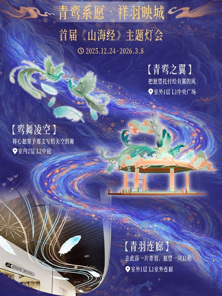 位于普陀的长风大悦城将推出首届《山海经》主题灯会跨年专场“山海系愿·青鸾引新岁”。12月31日跨年当天 15:00-17:00和18:00-20:00,“声动山海”跨年音乐会携苏州评弹、昆曲雅韵与新潮音乐会将轮番登场,以国潮音律点燃仪式之夜,届时以《山海经》中青鸾鸟为原型打造的主题美陈将惊艳亮相,青鸾振翅、云羽流光,开启沉浸式神话图景。14:30-15:00和17:00-17:30,户外广场还将开启鱼灯巡游,彩灯如银河流动,寓意“鱼跃岁欢,灯引福至”,点亮跨年夜色。此外,“普熙金融广场PUSH艺术中心将上演“ORIGINS零点艺术夜”,以一场持续至元旦凌晨的音乐演出,陪伴市民迎接新年第一缕晨光。