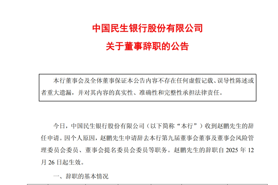 12月26日,民生银行公告称,因个人原因,赵鹏申请辞去本行第九届董事会董事及董事会风险管理委员会委员、董事会提名委员会委员等职务。赵鹏的辞职自2025年12月26日起生效。