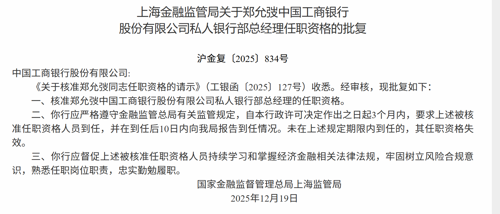 12月29日,上海金融监管局发布关于郑允弢中国工商银行股份有限公司私人银行部总经理任职资格的批复,核准郑允弢中国工商银行股份有限公司私人银行部总经理的任职资格。