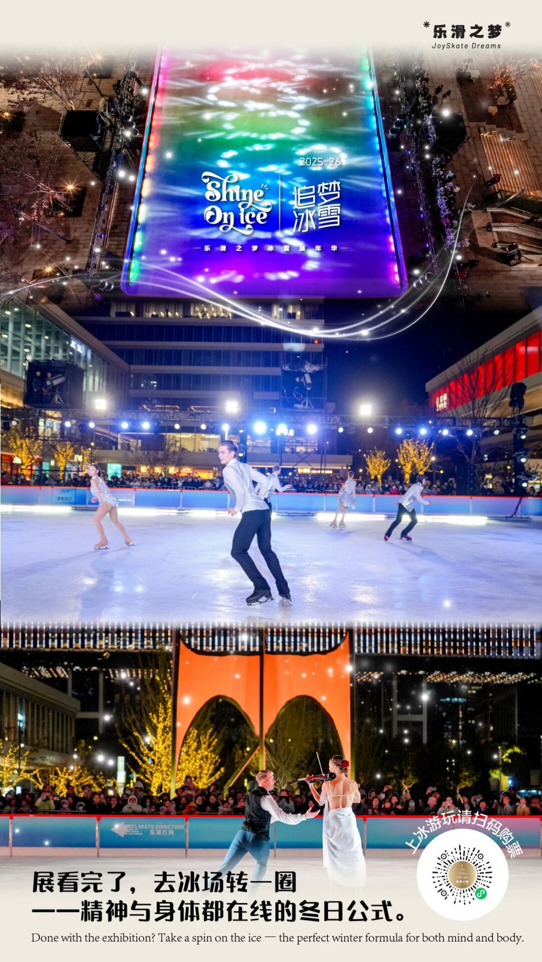 上海花木时光里携手中国新锐娱乐冰场品牌“乐滑之梦”打造花木国际冰雪嘉年华(2025年11月28日-2026年3月1日),设立露天冰场,以音乐、灯光与冰舞编制梦幻舞台,与毗邻的上海博物馆东馆相呼应,自然延伸出“逛展+踏冰”的冬日动线,打造亲子情侣朋友冬日运动娱乐好去处。长宁来福士“乐滑之梦冰雪嘉年华”同步推出票根经济活动,持续至2026年1月31日,凭票根可在数十家场内品牌享受折扣和赠礼。