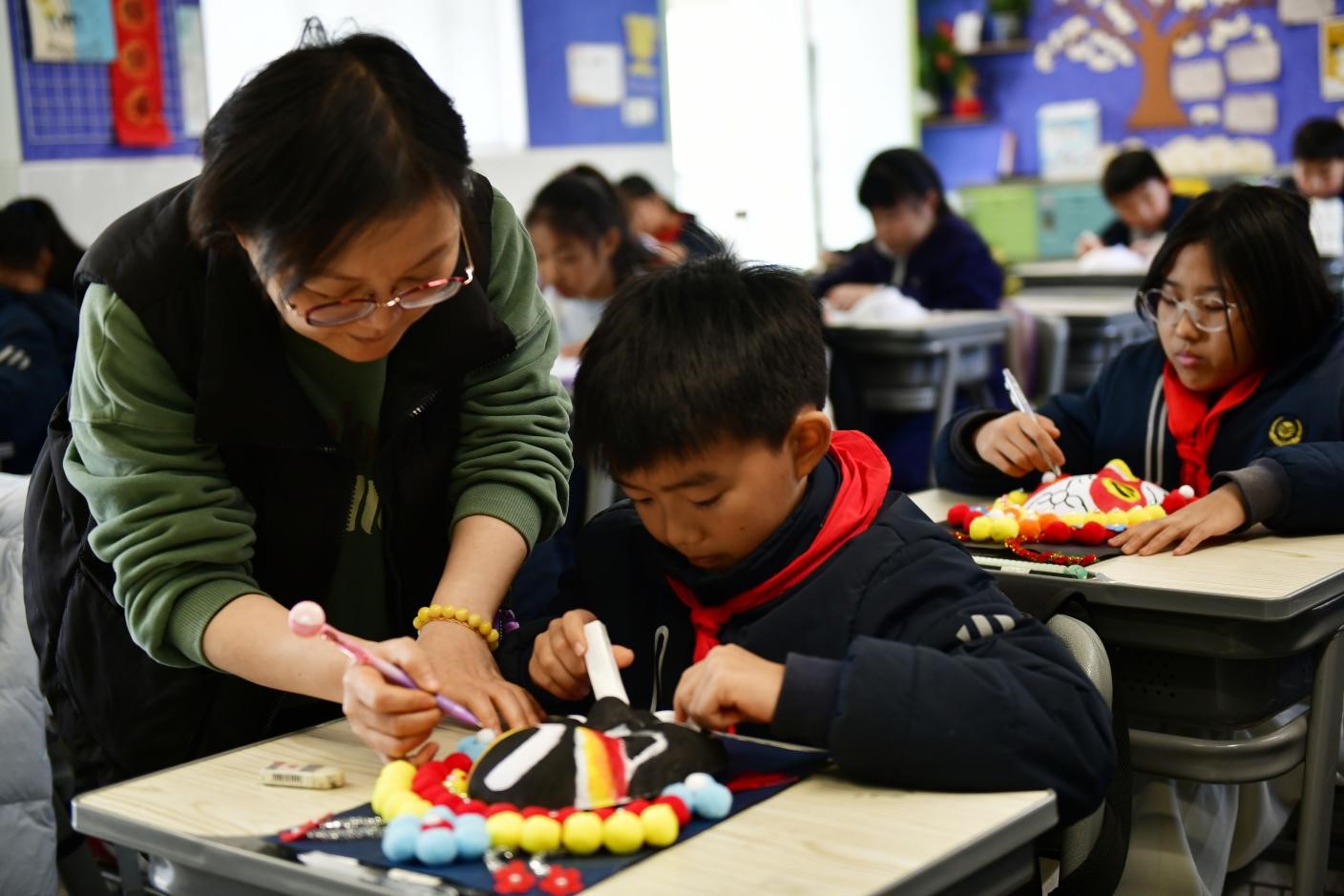 美术教研组长倪紫仪介绍,学校立足校本课程积淀,将适配学生年龄特点的非遗项目融入日常教学,逐步构建起非遗美育课程体系。例如,一、二年级接触剪纸和基础泥塑,三年级绘制国画扇面,四年级设计“云肩”纹样,五年级则尝试制作京剧元素手工艺品。此外,学校还依托教师专长,开设掐丝珐琅、陶泥、汉服设计、版画与蓝晒等社团,引导学生在深入理解传统文化的基础上进行创新。