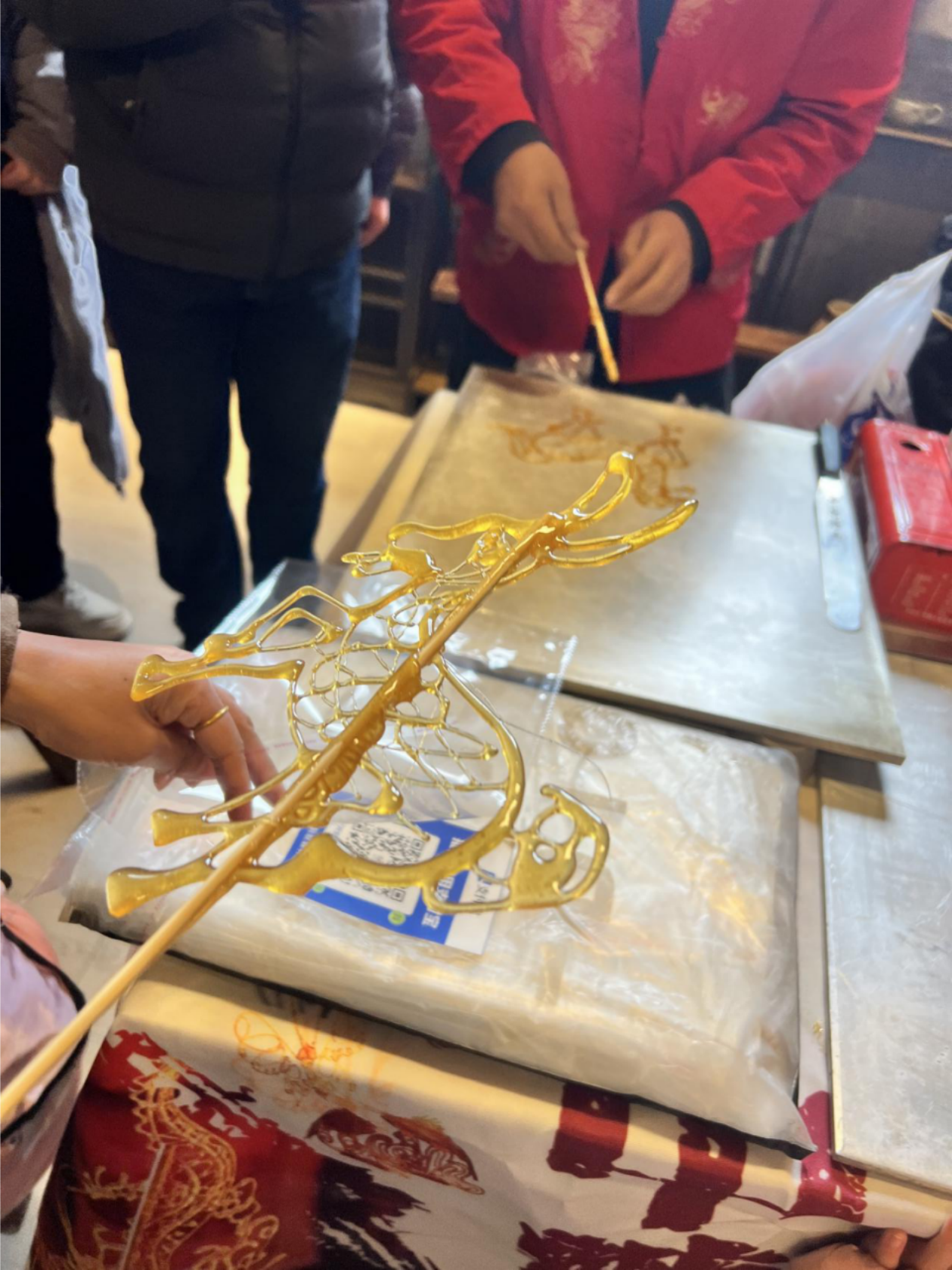 “因为今年是马年,所以我想要一匹小马,特别可爱,我很喜欢,都舍不得吃了!”小朋友薛知焓开心地展示着她的小马糖画。