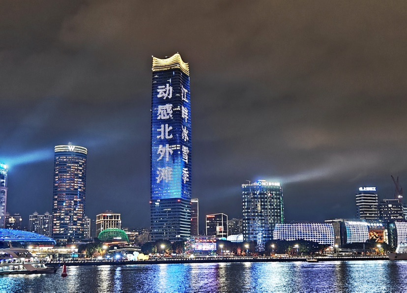 活动整体视觉设计以“红、白、金”为基调,国客中心网红地标海事塔披上巨型毛绒围巾,成为暖冬符号;新春大型艺术装置“马上有钱”空降太平路入口,为冬日滨江增添活泼亮色;冰场与市集区域则通过星星灯、铃铛、小马挂件点缀,渲染温馨绚丽节日场景。