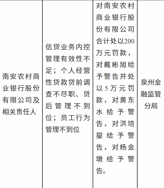 12月31日,泉州金融监管分局行政处罚信息公示表显示,南安农村商业银行股份有限公司及相关责任人因信贷业务内控管理有效性不足;个人经营性贷款贷前调查不尽职、贷后管理不到位;员工行为管理不到位被合计处以200万元罚款,戴某旭被警告并处以5万元罚款,黄某水、洪某鋆、杨某墩被警告。