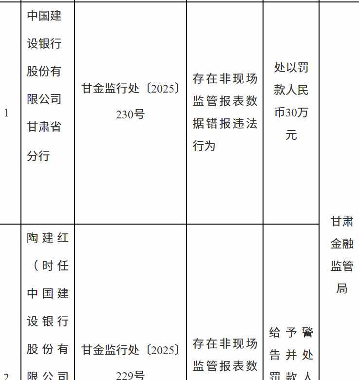 1月1日,国家金融监督管理总局甘肃监管局行政处罚信息公示表显示,中国建设银行股份有限公司甘肃省分行因存在非现场监管报表数据错报违法行为被罚款30万元;陶某红被警告并罚款人民币5万元。
