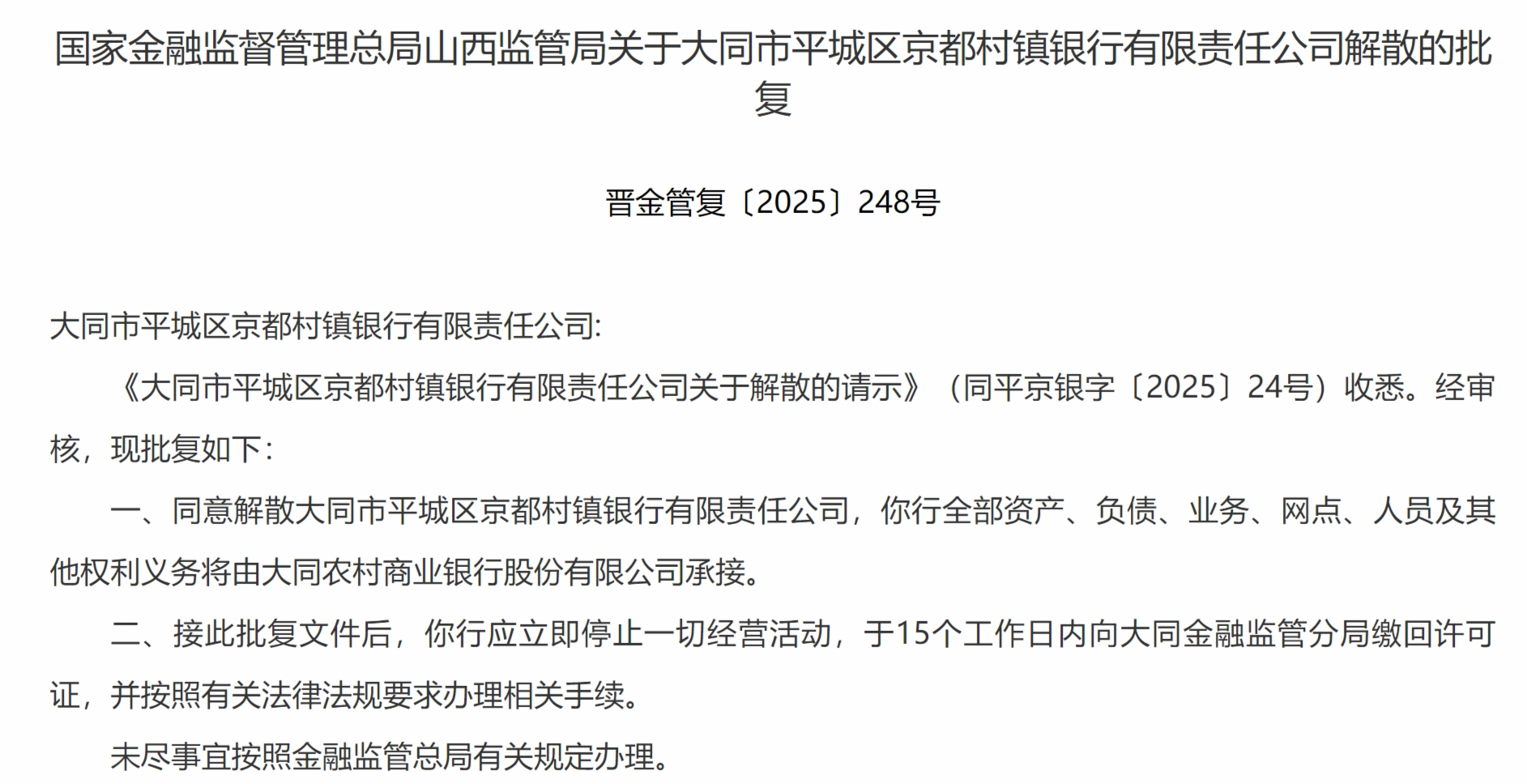 12月30日,国家金融监督管理总局山西监管局发布关于大同市平城区京都村镇银行有限责任公司解散的批复,同意解散大同市平城区京都村镇银行有限责任公司,该行全部资产、负债、业务、网点、人员及其他权利义务将由大同农村商业银行股份有限公司承接。