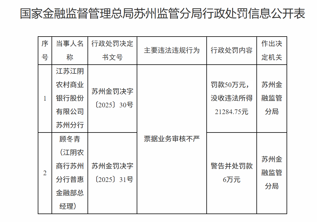 1月5日,国家金融监督管理总局苏州监管分局行政处罚信息公开表显示,江苏江阴农村商业银行股份有限公司苏州分行因票据业务审核不严被罚款50万元,没收违法所得21284.75元;顾某青被警告并处罚款6万元。