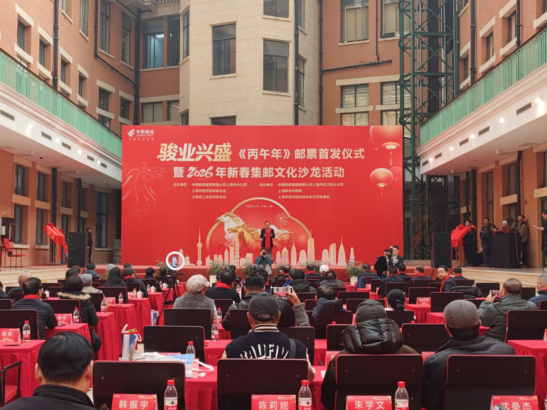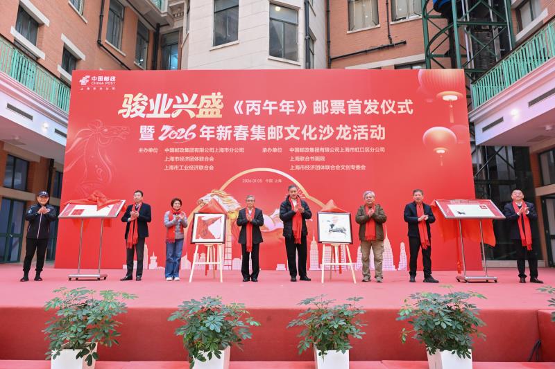 1月5日,由中国邮政集团有限公司上海市分公司、上海市经济团体联合会、上海工业经济联合会共同主办的“骏业兴盛”《丙午年》邮票发行仪式在苏州河畔的上海邮政大楼举行。仪式现场为《丙午年》大版邮票揭幕。