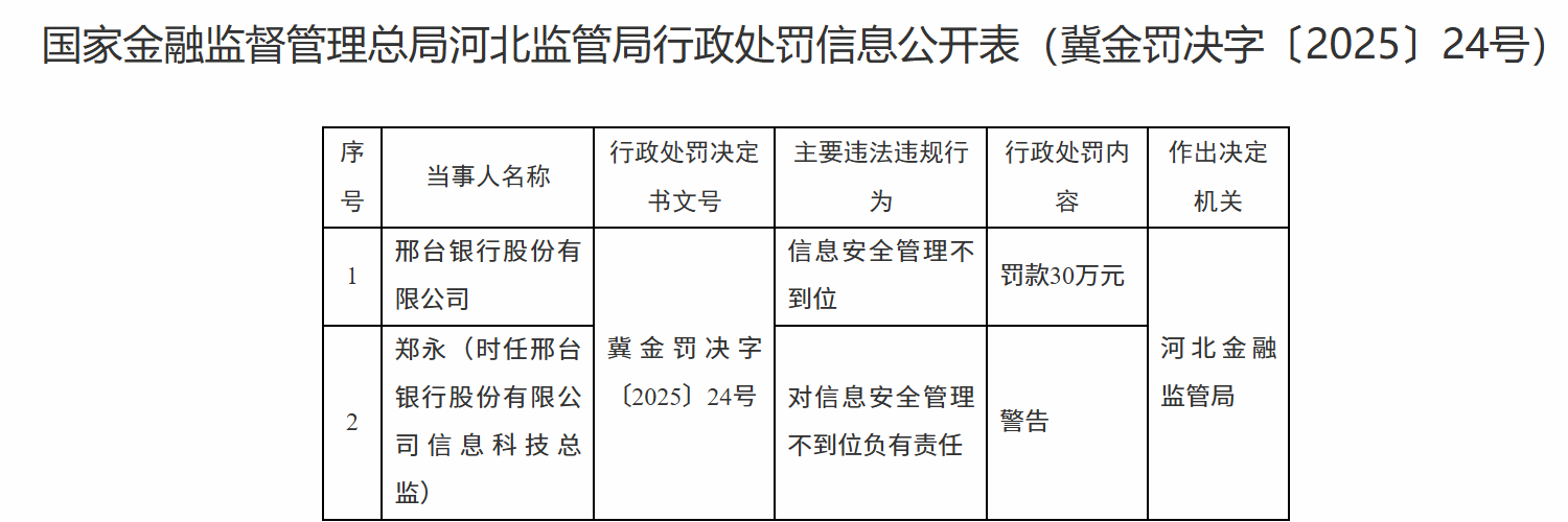 1月6日,国家金融监督管理总局河北监管局行政处罚信息公开表显示,邢台银行股份有限公司因信息安全管理不到位被罚款30万元;郑某被警告。
