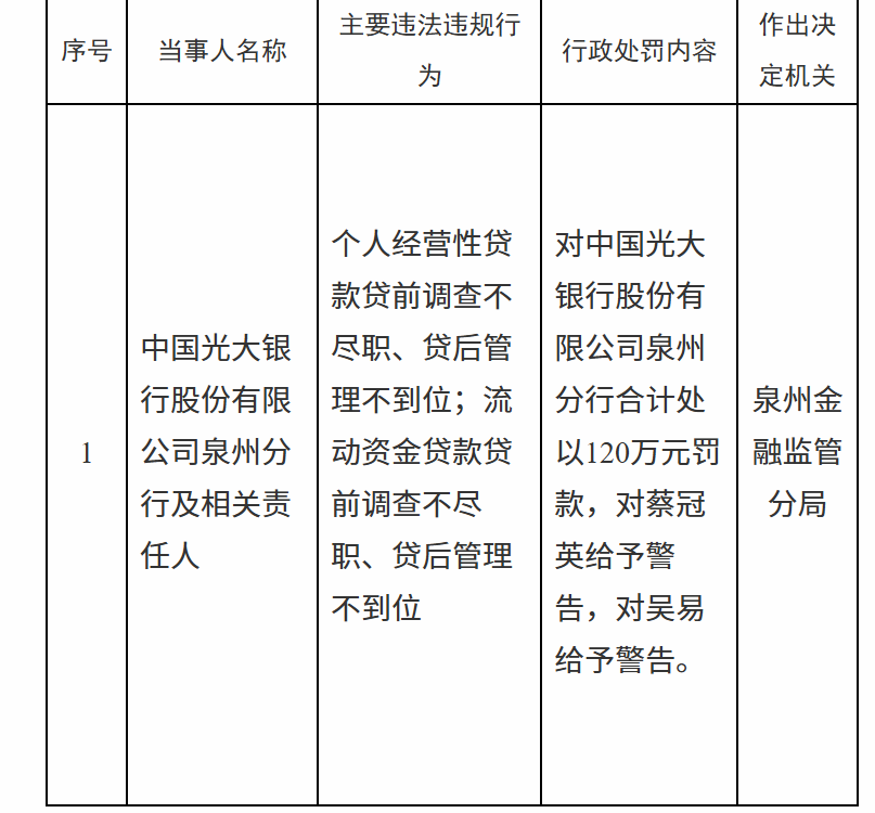 1月6日,泉州金融监管分局行政处罚信息公示表显示,中国光大银行股份有限公司泉州分行及相关责任人因个人经营性贷款贷前调查不尽职、贷后管理不到位;流动资金贷款贷前调查不尽职、贷后管理不到位被合计处以120万元罚款,吴某、蔡某英被给予警告。