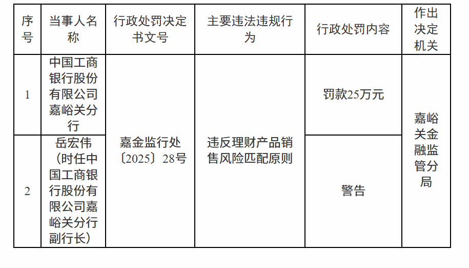 中国工商银行嘉峪关分行因违反理财产品销售风险匹配原则被罚款25万元