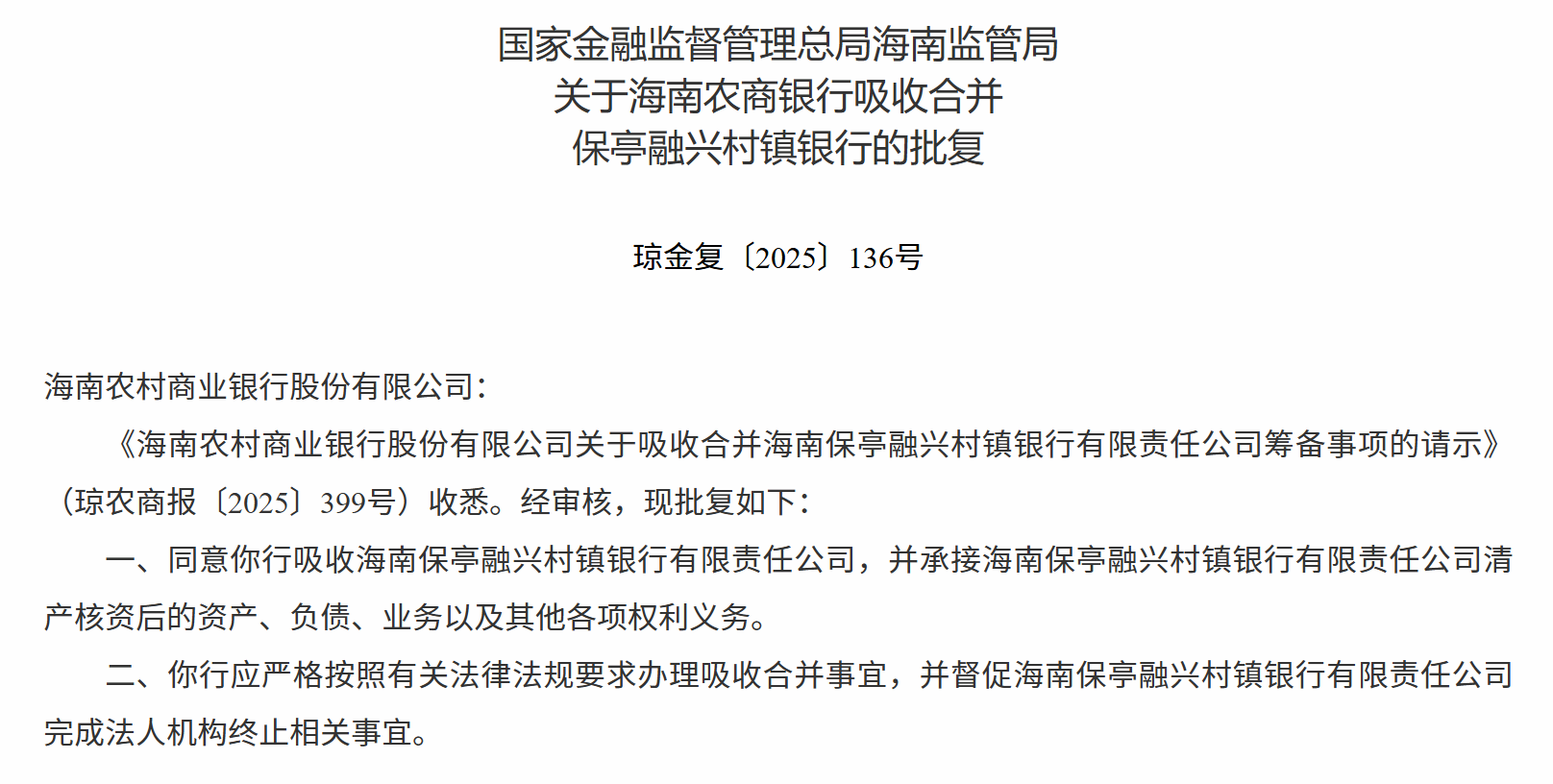 1月6日,国家金融监督管理总局海南监管局发布关于海南农商银行吸收合并保亭融兴村镇银行的批复,同意你行吸收海南保亭融兴村镇银行有限责任公司,并承接海南保亭融兴村镇银行有限责任公司清产核资后的资产、负债、业务以及其他各项权利义务。