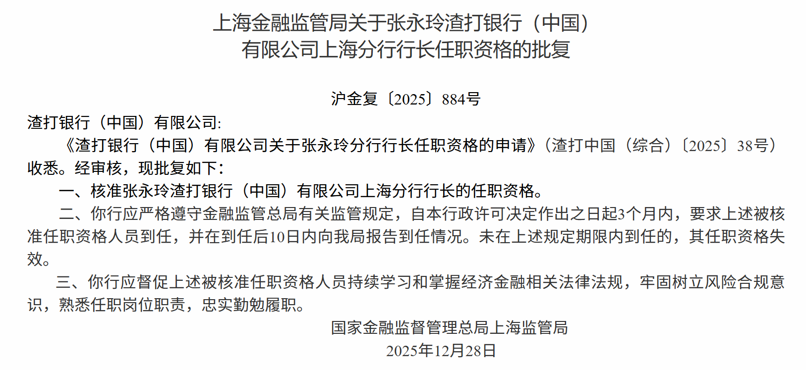 1月7日,上海金融监管局发布关于张永玲渣打银行(中国)有限公司上海分行行长任职资格的批复,核准张永玲渣打银行(中国)有限公司上海分行行长的任职资格。