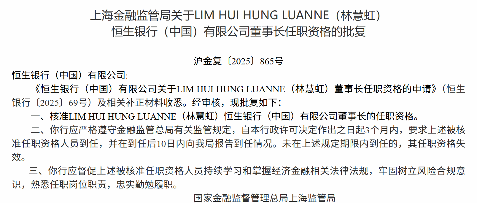 1月7日,上海金融监管局发布关于LIMHUIHUNGLUANNE(林慧虹)恒生银行(中国)有限公司董事长任职资格的批复,核准LIMHUIHUNGLUANNE(林慧虹)恒生银行(中国)有限公司董事长的任职资格。