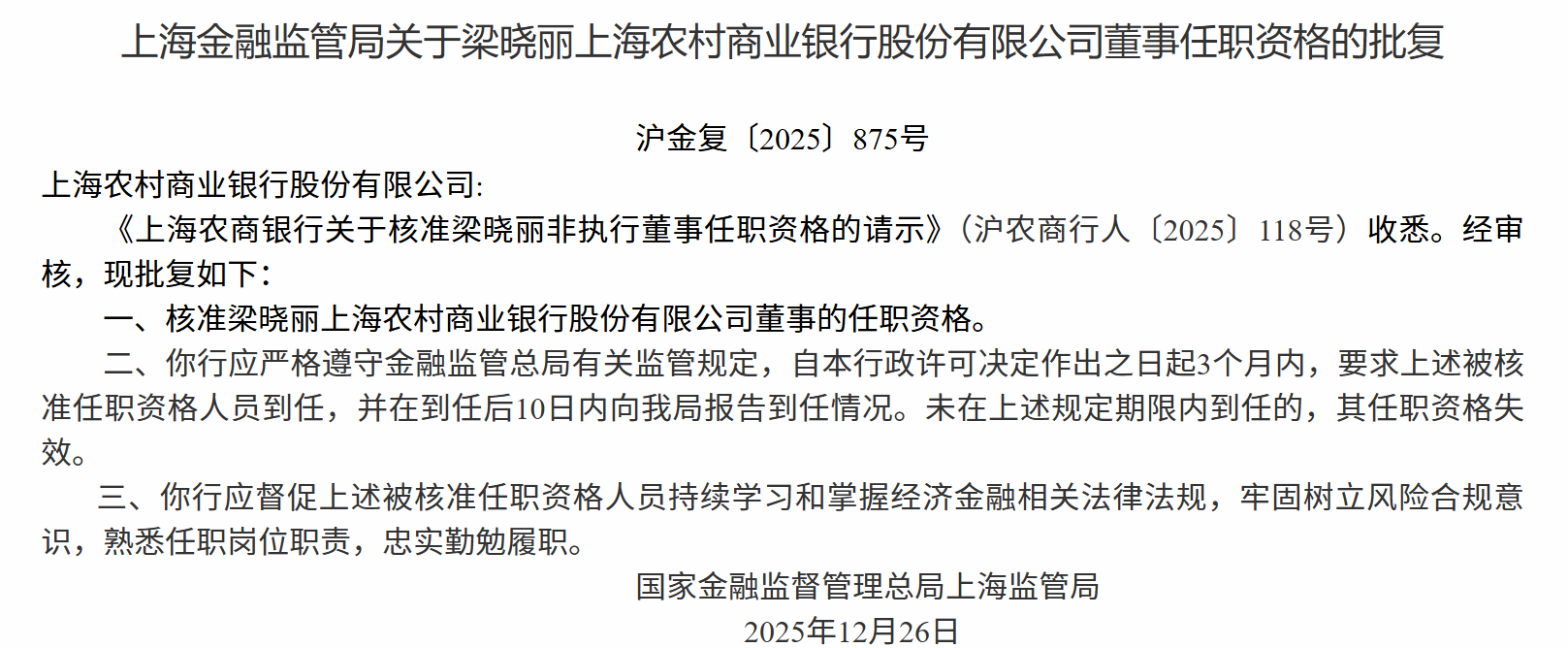 1月7日,上海金融监管局发布关于梁晓丽上海农村商业银行股份有限公司董事任职资格的批复,核准梁晓丽上海农村商业银行股份有限公司董事的任职资格。