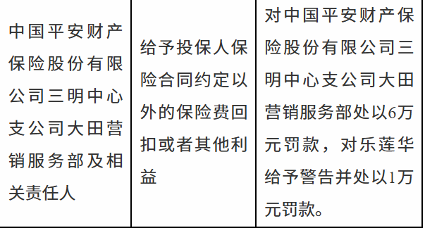 1月6日,三明金融监管分局行政处罚信息公示表显示,中国平安财产保险股份有限公司三明中心支公司大田营销服务部及相关责任人因给予投保人保险合同约定以外的保险费回扣或者其他利益被处以6万元罚款,乐某华被给予警告并处以1万元罚款。
