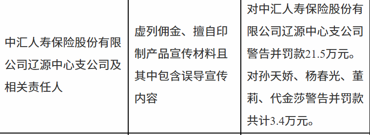 1月7日,国家金融监督管理总局辽源监管分局行政处罚信息公示表显示,中汇人寿保险股份有限公司辽源中心支公司因虚列佣金、擅自印制产品宣传材料且其中包含误导宣传内容被警告并罚款21.5万元。责任人孙某娇、杨某光、董某、代某莎被警告并罚款共计3.4万元。