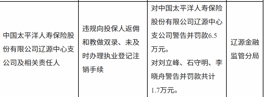 1月7日,国家金融监督管理总局辽源监管分局行政处罚信息公示表显示,中国太平洋人寿保险股份有限公司辽源中心支公司因违规向投保人返佣和教做双录、未及时办理执业登记注销手续被警告并罚款6.5万元。责任人刘某峰、石某明、李某舟被警告并罚款共计1.7万元。