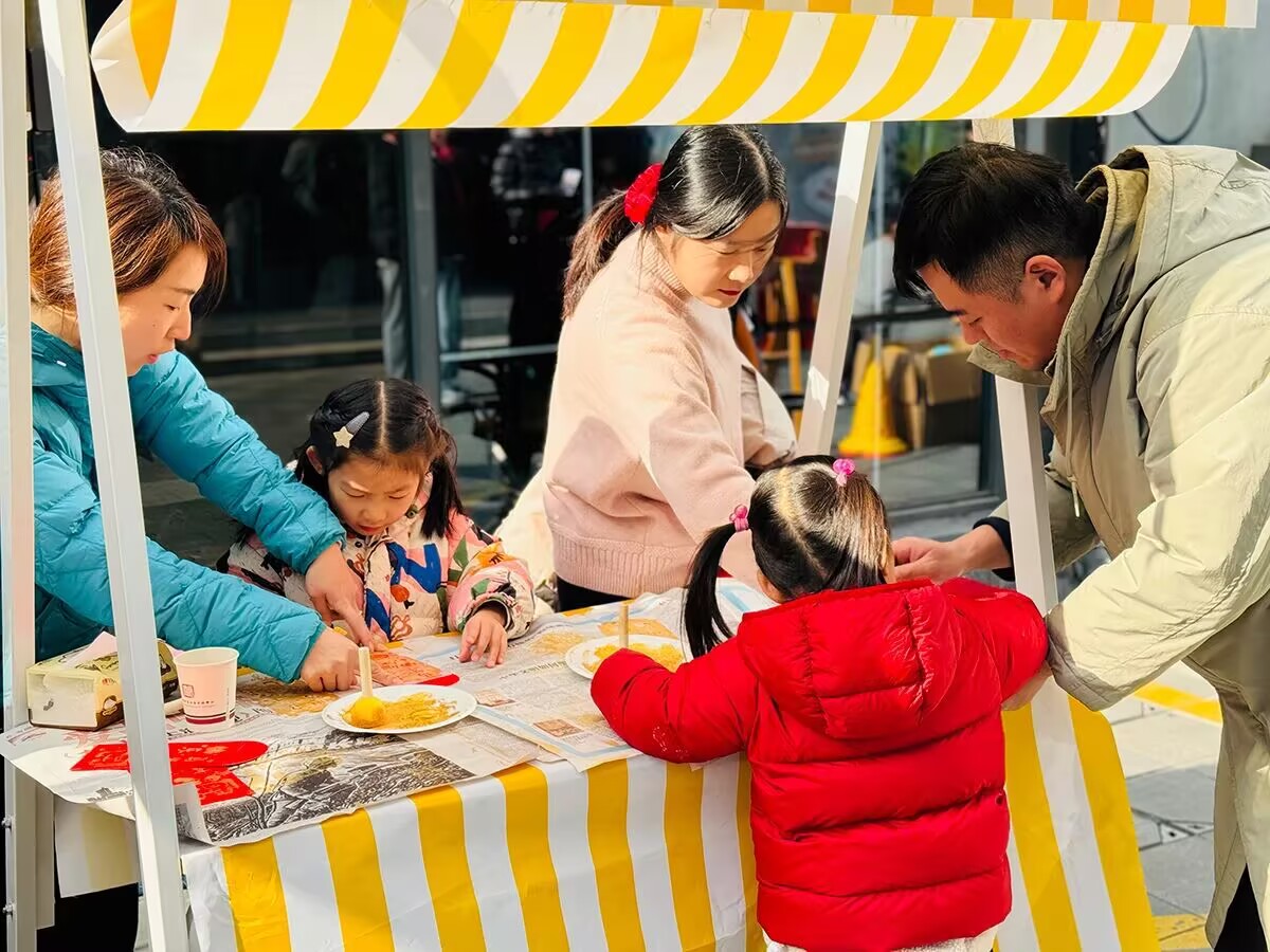 户外拓印集福区,亲子家庭手持模具蘸取金墨,在红纸上拓印出寓意吉祥的马年图案,感受传统技艺的独特魅力;非遗竹编体验区,专业老师手把手指导孩子们编织特色竹编,指尖流转间让非遗技艺“活”起来;马年冰箱贴DIY、毛毡摇摇乐制作等项目,让家长与孩子在共同创作中解锁传统文化与民俗乐趣,既传递了辞旧迎新的美好愿景,更将红色基因与家国情怀融入节日氛围,让党群中心成为弘扬传统文化、树立文化自信的“文化乐园”。