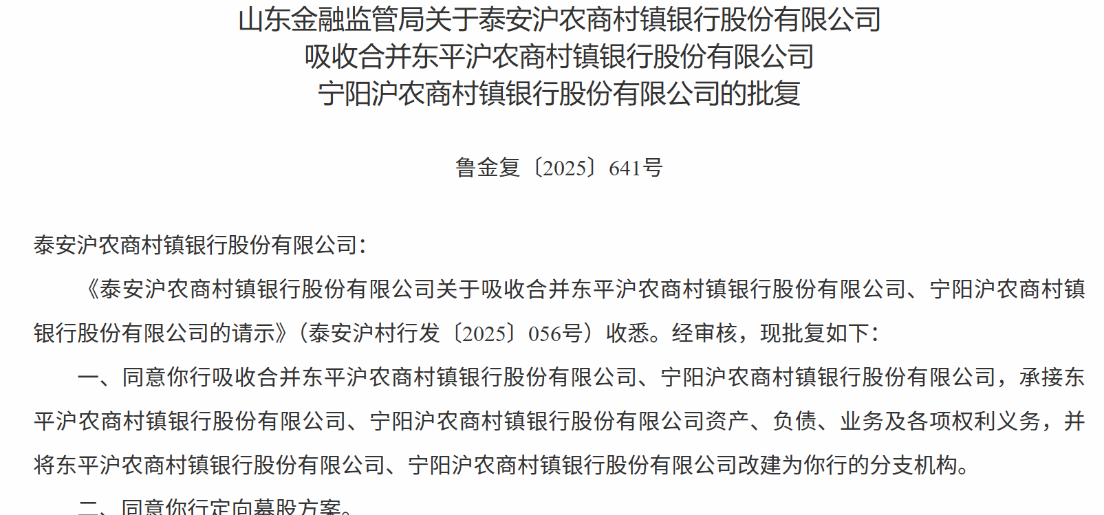 泰安沪农商村镇银行获批吸收合并东平沪农商村镇银行、宁阳沪农商村镇银行