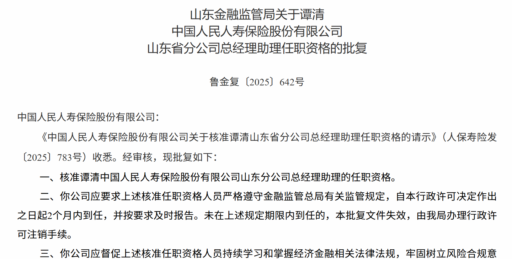 1月8日,山东金融监管局发布关于谭清中国人民人寿保险股份有限公司山东省分公司总经理助理任职资格的批复,核准谭清中国人民人寿保险股份有限公司山东分公司总经理助理的任职资格。