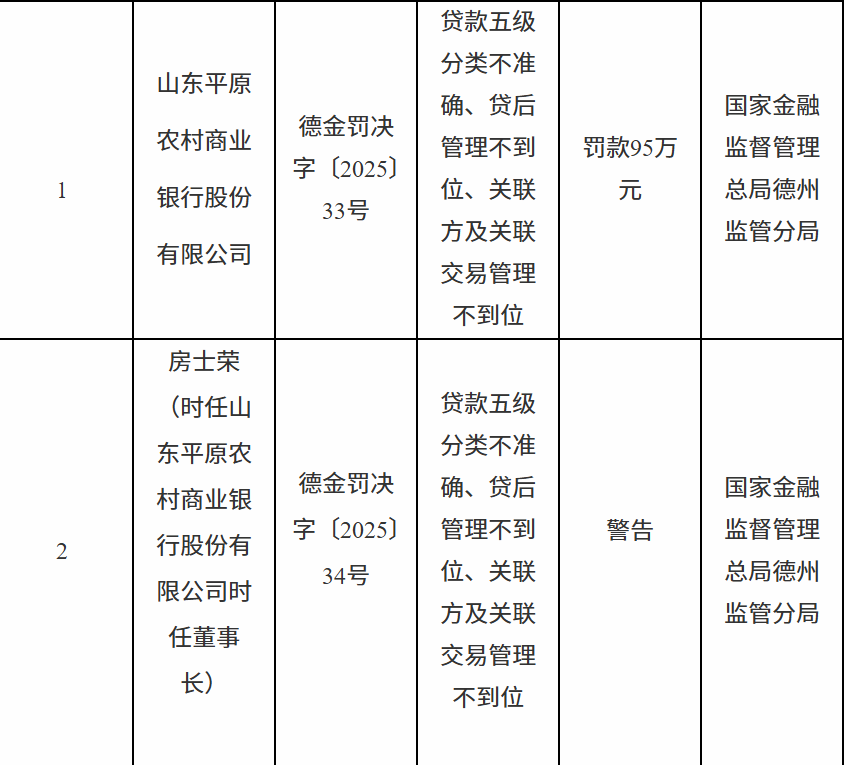 1月7日,国家金融监督管理总局德州监管分局行政处罚信息公开表显示,山东平原农村商业银行股份有限公司因贷款五级分类不准确、贷后管理不到位、关联方及关联交易管理不到位被罚款95万元;责任人房某荣被警告。