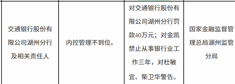 1月8日,国家金融监督管理总局湖州监管分局行政处罚信息公开表显示,交通银行股份有限公司湖州分行因内控管理不到位被罚款40万元。责任人金某被禁止从事银行业工作三年,杜某宜、柴某华被警告。