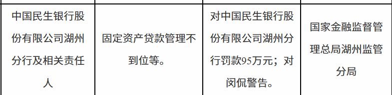 中国民生银行湖州分行因固定资产贷款管理不到位等被罚款95万元