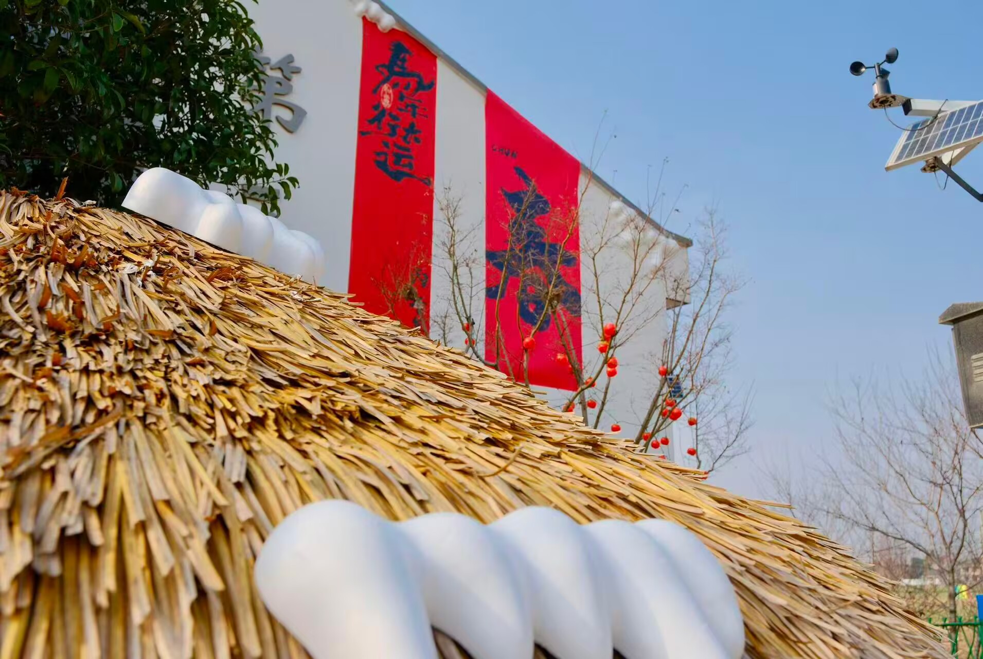 沿蕰杨路、方杨路漫步,道路两侧的绿植已挂上小桔灯与红灯笼。暖光莹莹,红火喜庆,为冬日的乡村道路铺就了一条温馨而充满节日气息的迎宾道。在宝锦稻米工坊门口,新增了充满年味的道路指示牌与二十四节气主题墙贴。一旁设置粉色长椅,可供游客找回一份童年的轻松欢愉。“第三空间”研学基地沿线空白墙面绘上了活泼的卡通元素;大草坪上洋桥“瑞士卷”草垛,也披上了研学主题的卡通彩绘新衣;屋檐、粮仓顶上的雪花装饰,象征着瑞雪兆丰年的喜悦。沿途的桥梁、十余个污水井盖及电箱,都披上了融合农耕文案的主题彩绘。此外,田野间添置的彩色小风车、同色系休憩木凳、白色小秋千以及特意设计的拍照打卡相框,每一处都充满发现美的乐趣,让每一步都有惊喜留念。电线杆底采用多巴胺风格的毛线进行编织装饰,部分略有磨损的桩基更被妙笔绘成“小猫抓鱼”的趣味画面,化瑕疵为艺术,尽显改造的用心与“变废为美”的巧思。