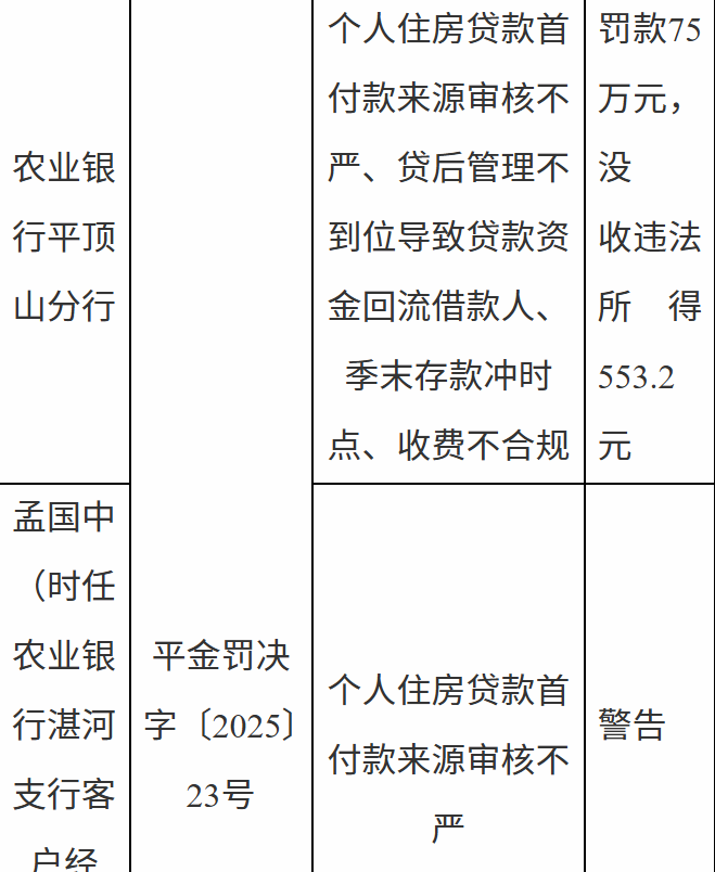 1月12日,国家金融监督管理总局平顶山监管分局行政处罚信息公示表显示,农业银行平顶山分行因个人住房贷款首付款来源审核不严、贷后管理不到位导致贷款资金回流借款人、季末存款冲时点、收费不合规被罚款75万元,没收违法所得553.2元。责任人孟某中、杨某华被警告。