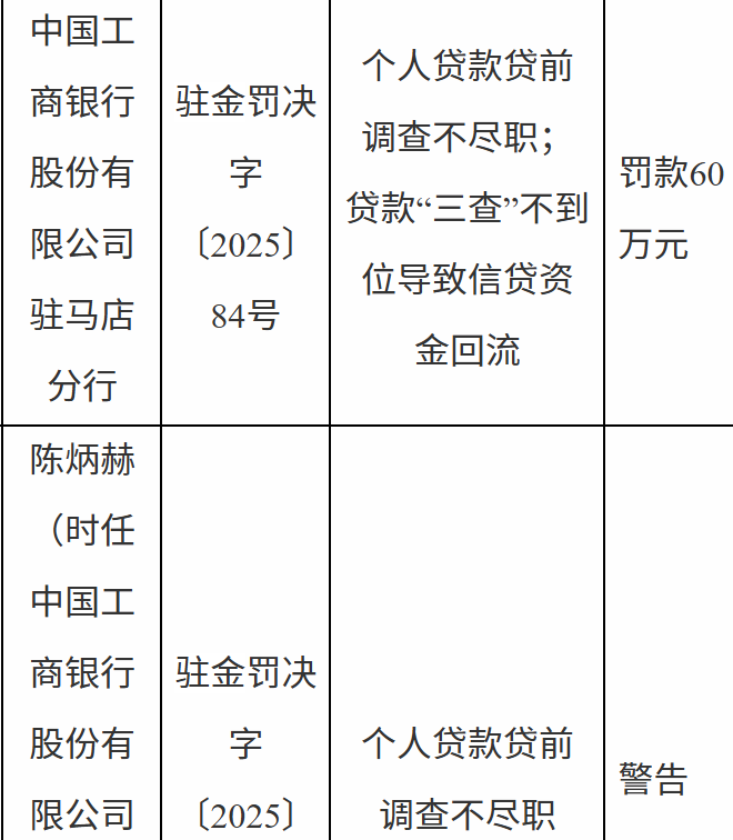 中国工商银行驻马店分行因个人贷款贷前调查不尽职等罚款60万元
