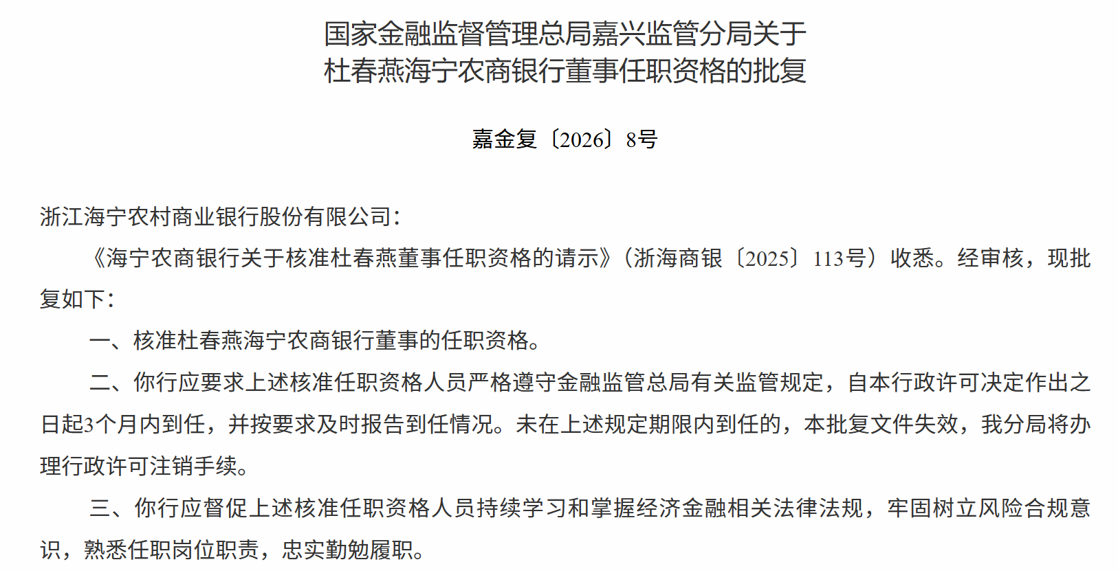 1月15日,国家金融监督管理总局嘉兴监管分局发布关于杜春燕海宁农商银行董事任职资格的批复,核准杜春燕海宁农商银行董事的任职资格。