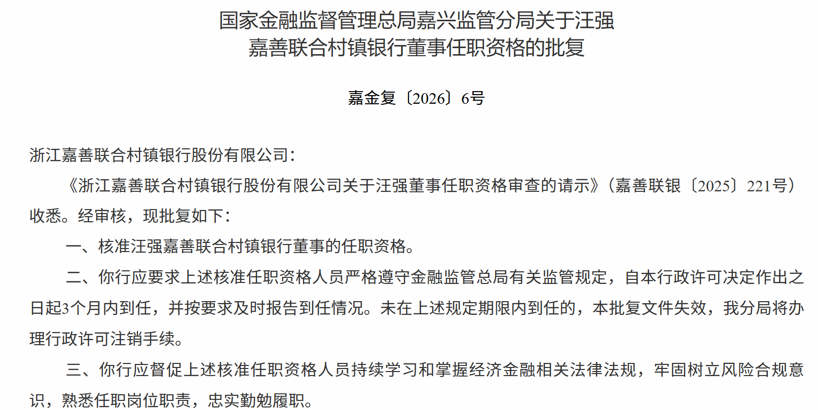1月15日,国家金融监督管理总局嘉兴监管分局发布关于汪强嘉善联合村镇银行董事任职资格的批复,核准汪强嘉善联合村镇银行董事的任职资格。