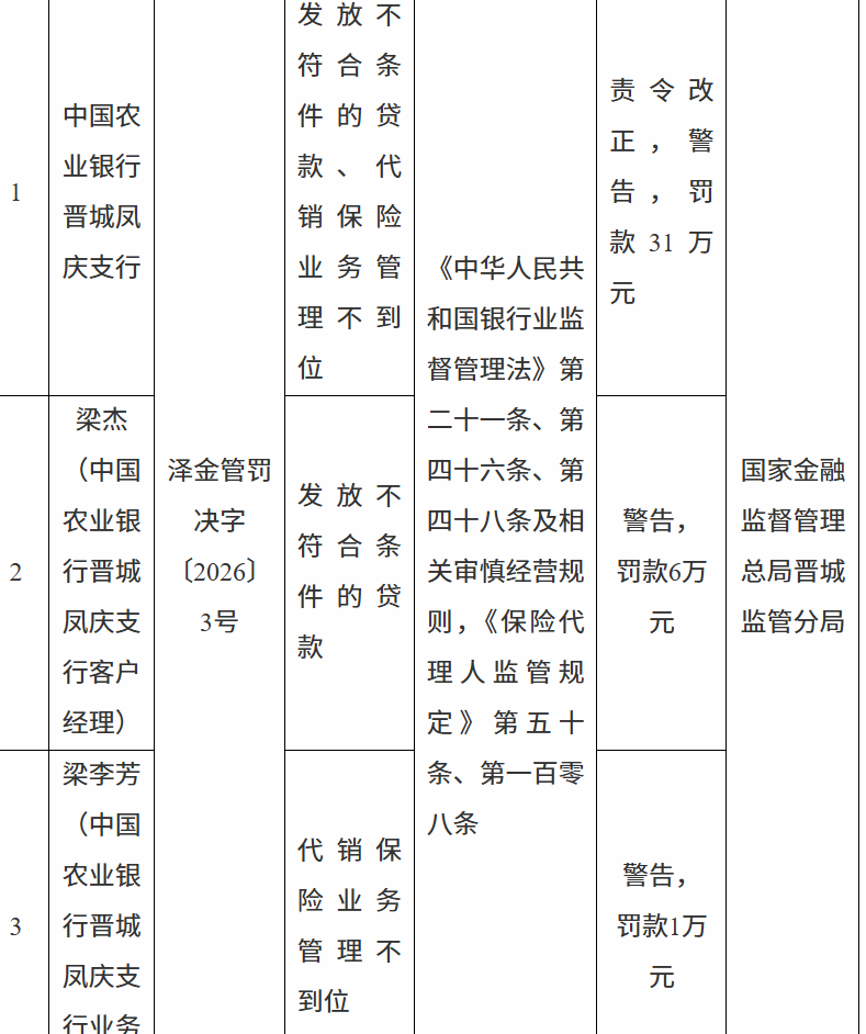 1月16日,国家金融监督管理总局晋城监管分局行政处罚信息公开表显示,中国农业银行晋城凤庆支行因发放不符合条件的贷款、代销保险业务管理不到位被责令改正,警告,罚款31万元。责任人梁某被警告并罚款6万元;梁某芳被警告并罚款1万元。