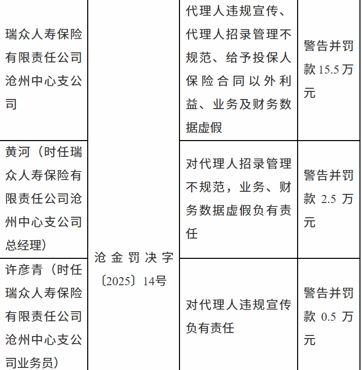 1月16日,国家金融监督管理总局沧州监管分局行政处罚信息公开表显示,瑞众人寿保险有限责任公司沧州中心支公司因代理人违规宣传、代理人招录管理不规范、给予投保人保险合同以外利益、业务及财务数据虚假被警告并罚款15.5万元。责任人黄某被警告并罚款2.5万元;许某青被警告并罚款0.5万元;陈某峰被警告并罚款1万元。