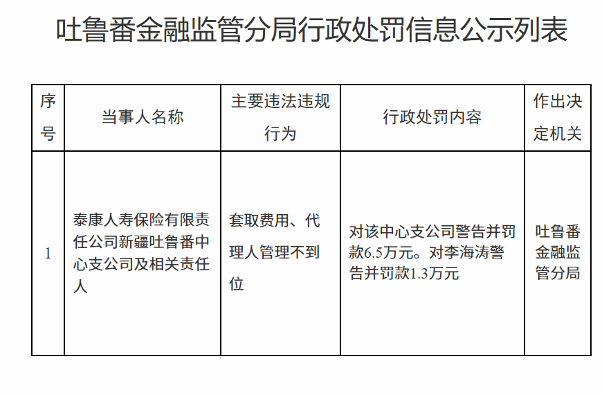 1月20日,吐鲁番金融监管分局行政处罚信息公示列表显示,泰康人寿保险有限责任公司新疆吐鲁番中心支公司因套取费用、代理人管理不到位被警告并罚款6.5万元。责任人李某涛被警告并罚款1.3万元。